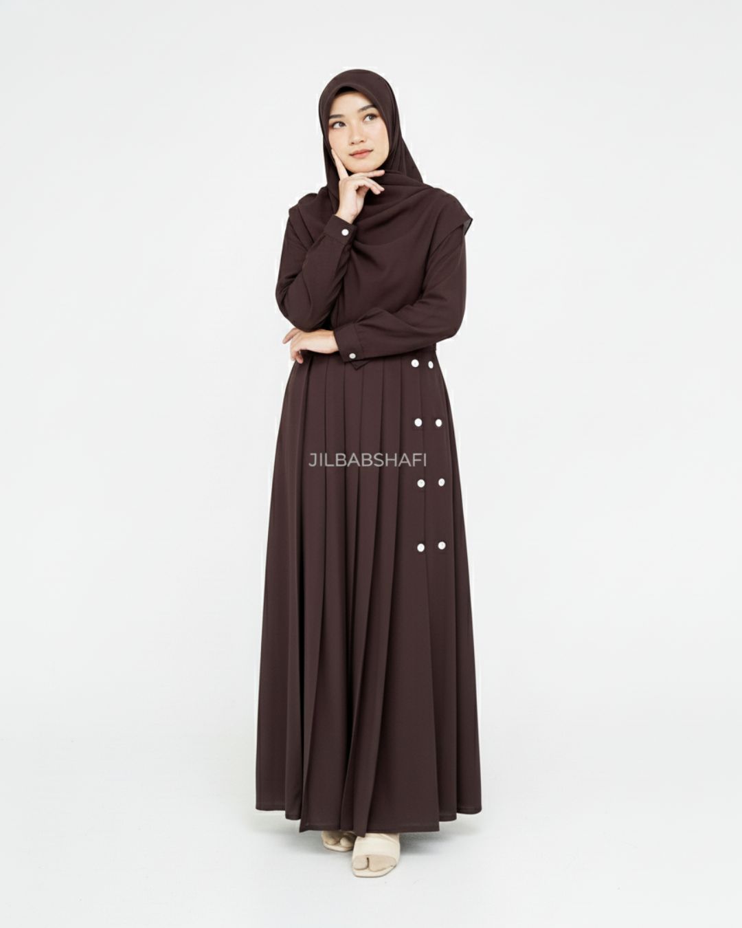 * Aksen kancing hias di bagian rok depan gamis